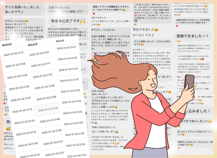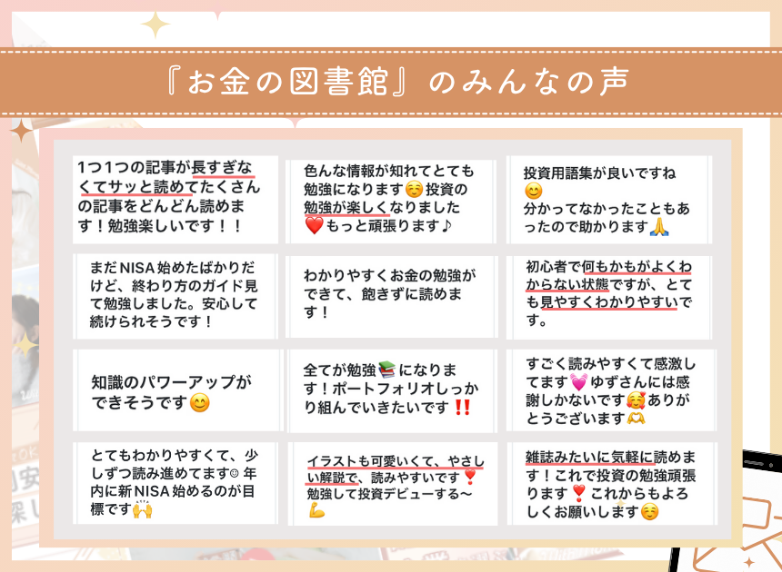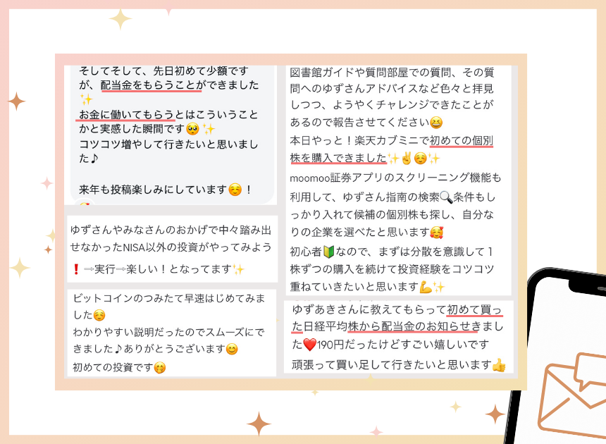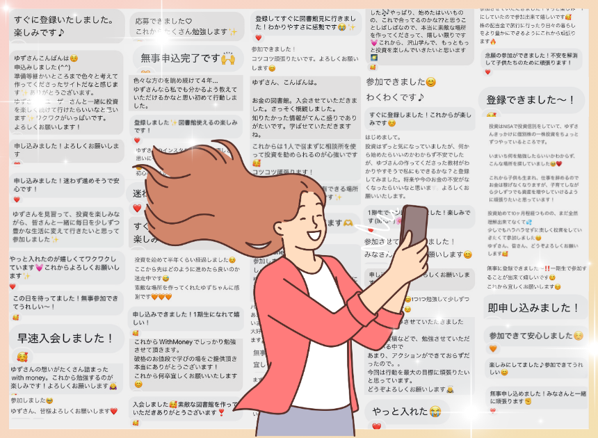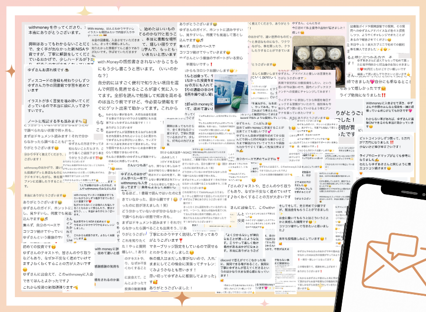 一緒に投資を進めるみんなからの、載せきれない数の口コミをいただいているよ✨