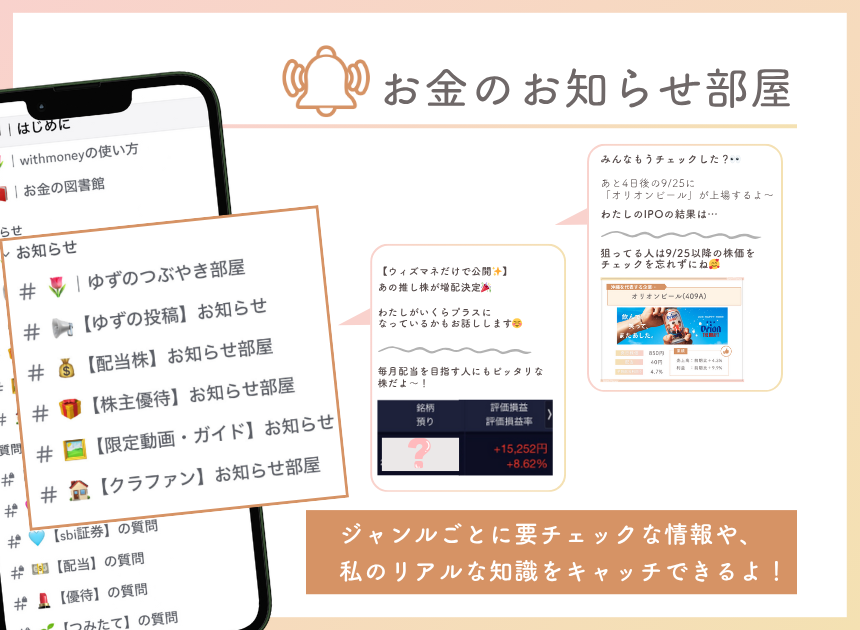 知っておきたいお金や投資の情報が、すぐにキャッチできる「お知らせ部屋」も用意しています✨