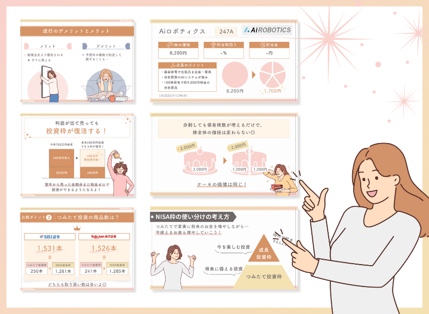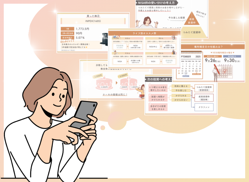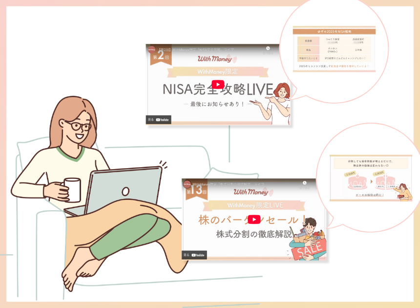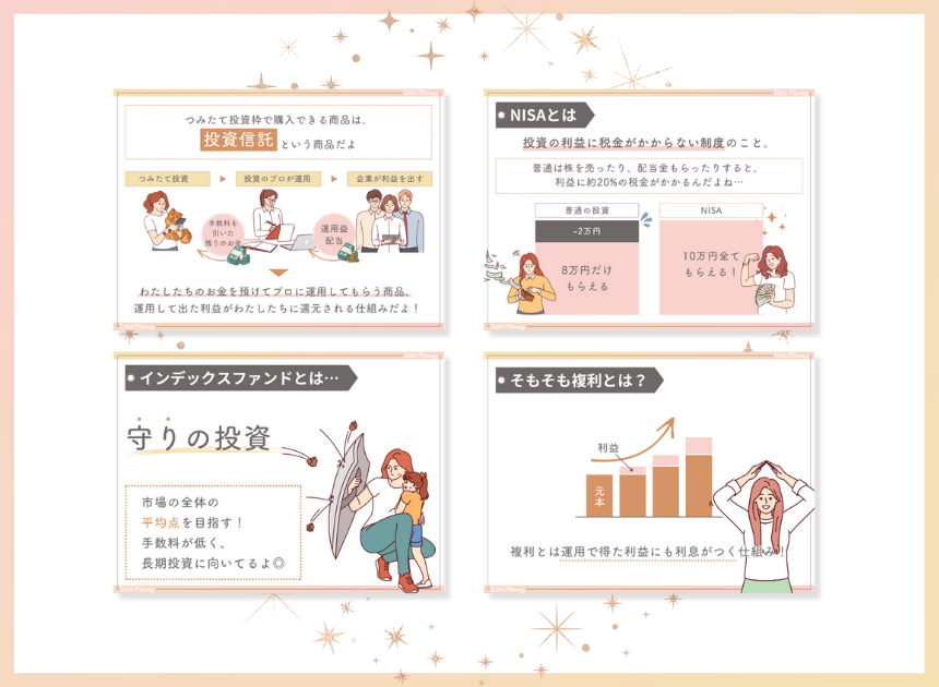 月1回の『お金の勉強会』では、LIVE形式でわたしと一緒に、投資やお金の知識を学ぶよ!