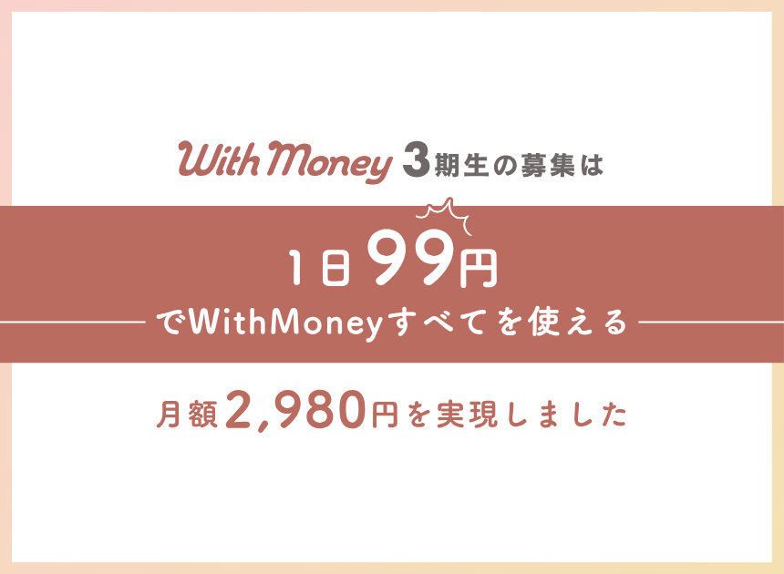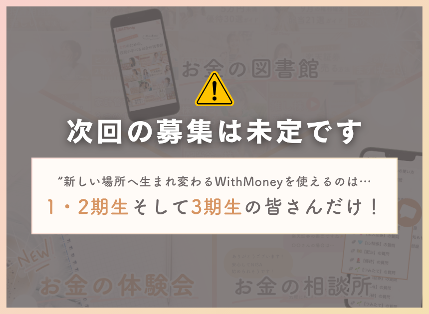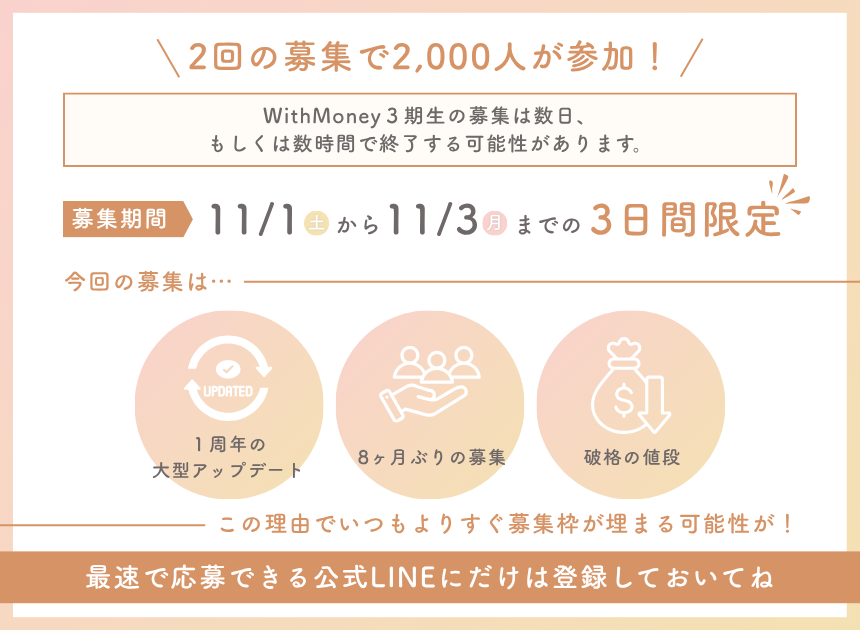 改めて、11/1(土)に3期生を募集開始するWithMoneyは、 数日で参加枠が埋まることが予想されます。